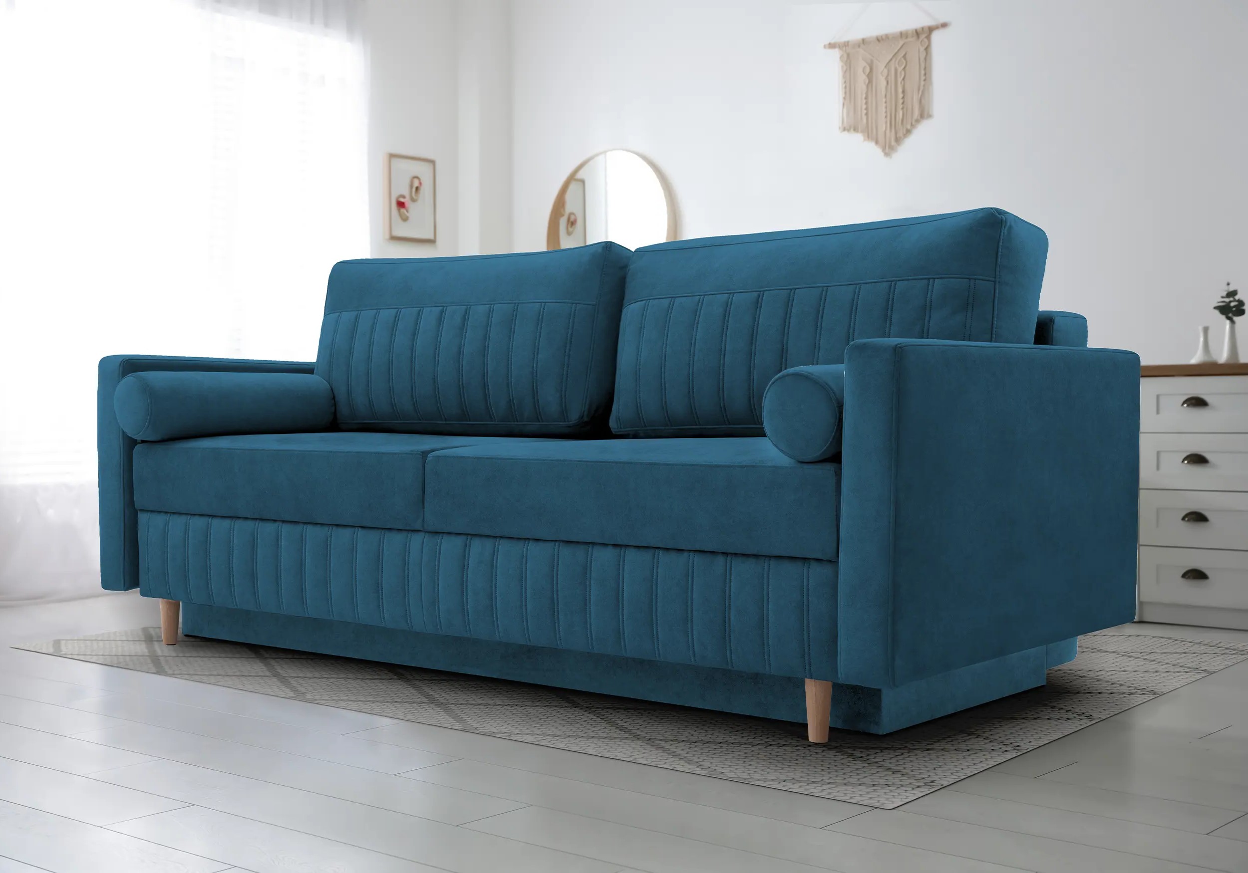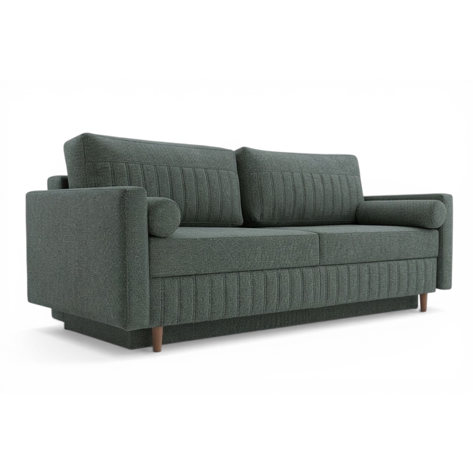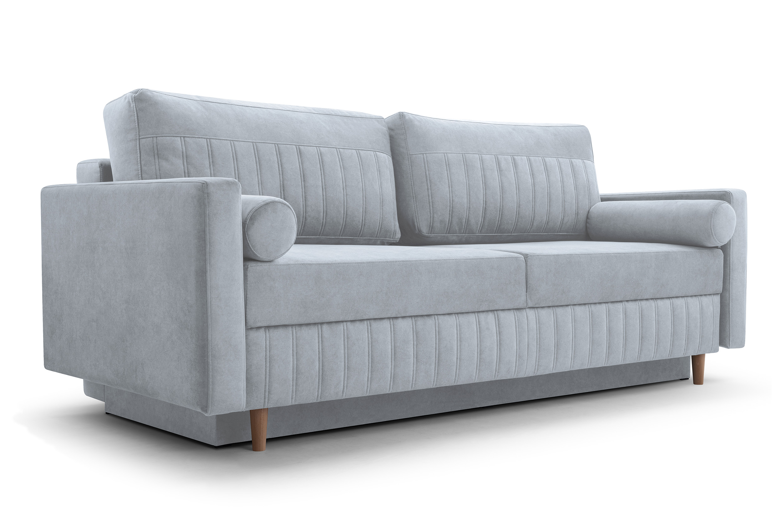 Konstrukce je doplněna o výplň z pěny a pružin, což zajišťuje příjemný komfort při sezení i spaní. Povrch tvoří měkká látka, která se dobře udržuje. Díky jednoduchému designu s jemným svislým prošitím a dřevěným nožkám se pohovka hodí jak do moderně zařízených prostor, tak do klasičtějších interiérů.