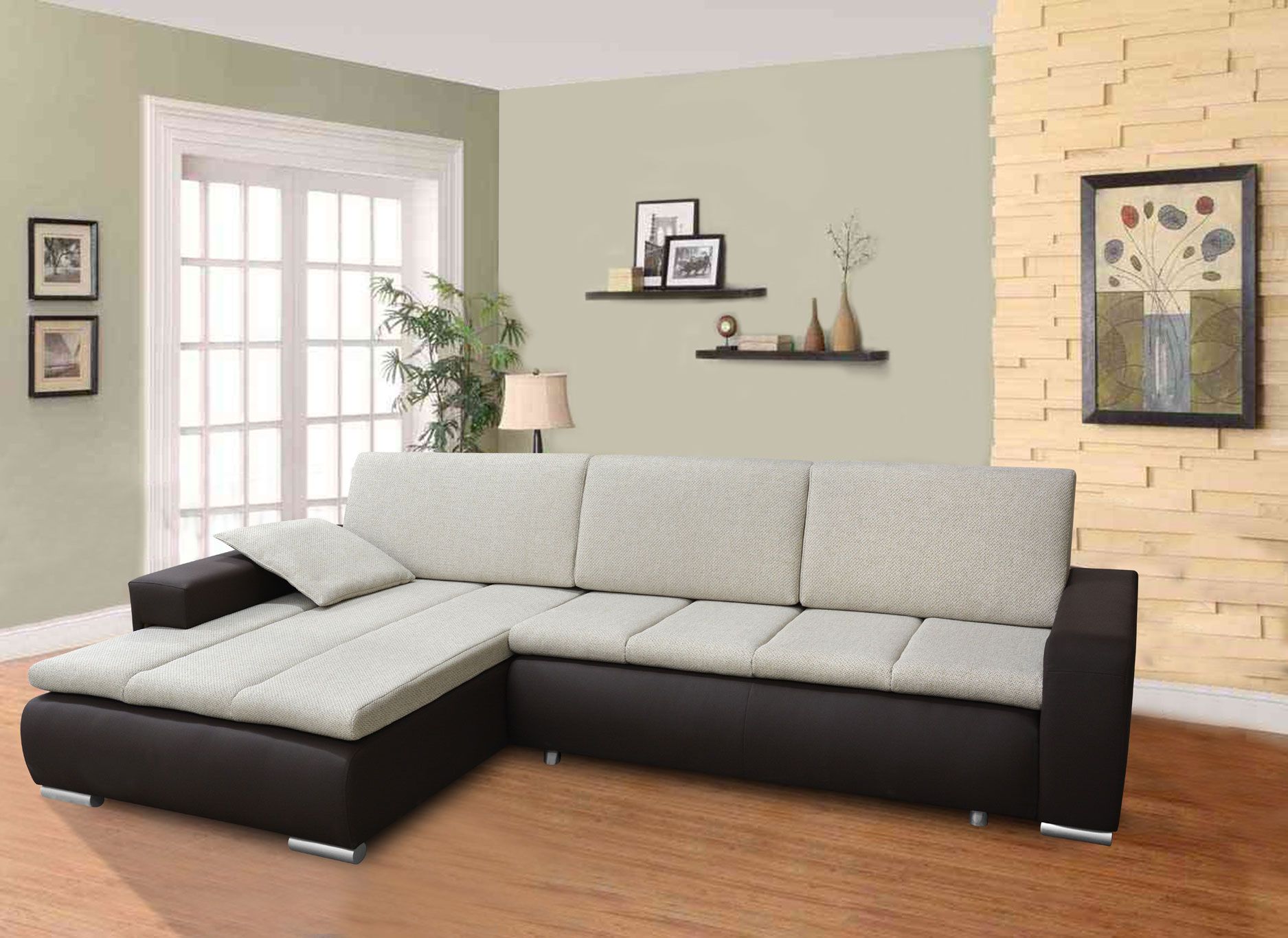 Pohodlná moderní sedací souprava s velkou plochou pro sezení. Disponuje úložným prostorem a funkcí snadného rozkladu. Sedák je vyplněn PUR pěnou na vlnovcové pružině.